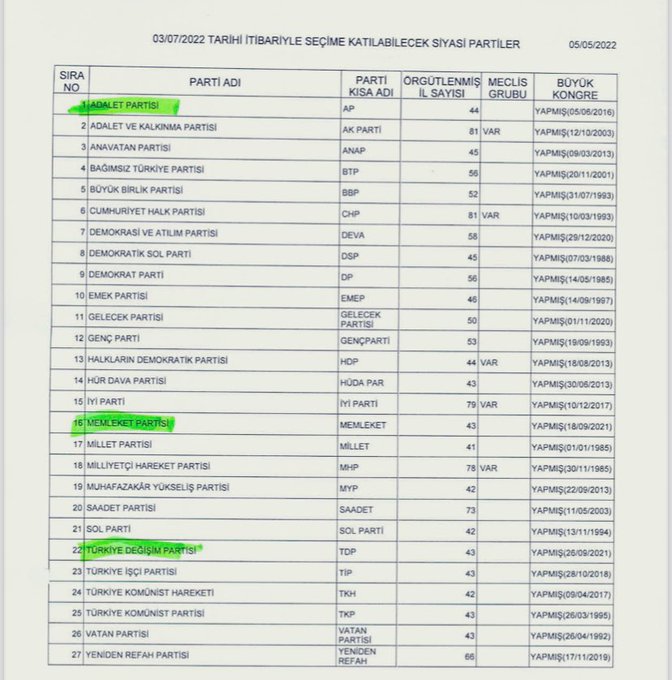 "Son yayınlanan seçime katılma yeterliliğine sahip partilere Adalet Partisi,Memleket Partisi ve Türkiye Değişim Partisi eklendi." ifadelerini kullanan Öztürk, böylelikle seçimlere katılabilecek parti sayısının da 27'ye yükseldiğini aktardı.