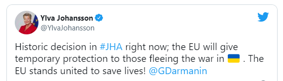 Avrupa Birliği (AB) ülkeleri Ukrayna’da savaş nedeniyle kaçan sığınmacıları hızlı ve bürokratik engeller olmadan alma konusunda uzlaştı. DW Türkçe'nin haberine göre uzlaşma haberini AB Komisyonu’nun içişlerinden sorumlu temsilcisi Ylva Johansen Twitter hesabından yaptığı açıklama ile duyurdu. Johansson mesajında uzlaşmayı "tarihi" olarak nitelendirerek, "AB Ukrayna’daki savaştan kaçanları geçici olarak koruyacak. AB hayat kurtarmak için birarada" ifadesine yer verdi.