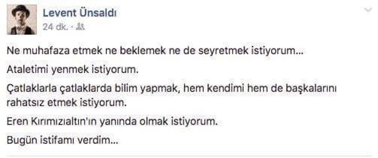 Ankara Üniversitesi Dil Tarih ve Coğrafya Fakültesi Sosyoloji bölümünde görevli akademisyen Doç. Dr. Levent Ünsaldı görevinden istifa etti. Barış için akademisyenler imzacıları arasında bulunan Ünsaldı, istifasını kişisel Facebook sayfasından duyurdu.