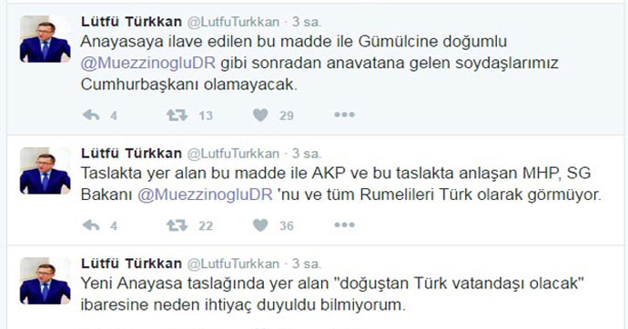 "Yeni Anayasa taslağında yer alan 'doğuştan Türk vatandaşı olacak' ibaresine neden ihtiyaç duyuldu bilmiyorum. Taslakta yer alan bu madde ile AKP ve bu taslakta anlaşan MHP, SG Bakanı @MuezzinogluDR'nu ve tüm Rumelileri Türk olarak görmüyor. Anayasa maddesine ilave edilen bu madde ile Gümülcine doğumlu @MuezzinogluDR gibi sonradan anavatana gelen soydaşlarımız cumhurbaşkanı olamayacak."
