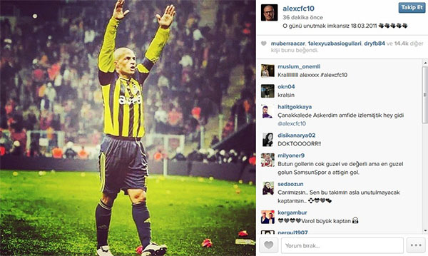 Instagram hesabından 18.03.2011 tarihinden bir fotoğraf paylaşan Alex, fotoğrafın altına 'O günü unutmak imkansız' notunu düştü. 18 Mart 2011 tarihinde Galatasaray'ın yeni stadı TT Arena'da ilk kez derbi oynanmış, Fenerbahçe Kazım golüyle 1-0 geriye düşmesine rağmen önce Semih sonra Alex'in golleriyle sahadan 2-1'lik galibiyetle ayrılmıştı.