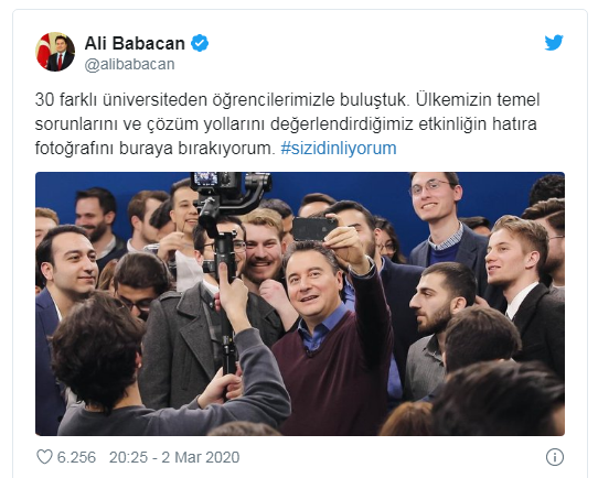 Babacan, paylaştığı fotoğrafa “30 farklı üniversiteden öğrencilerimizle buluştuk. Ülkemizin temel sorunlarını ve çözüm yollarını değerlendirdiğimiz etkinliğin hatıra fotoğrafını buraya bırakıyorum. #sizidinliyorum” yorumunu yaptı.