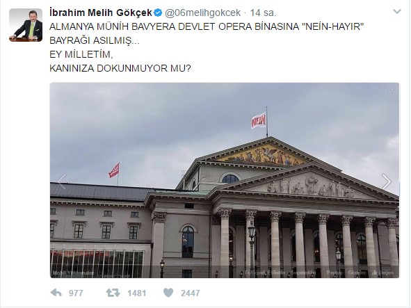 Oy kullanımına sayılı saatler kala Almanya Münih’te opera binasına "Hayır" bayrağının dikildiğini iddia etti. Yeni Şafak ve diğer yayın organları ile AKP'li troller yalan haberi hızla yaydı.