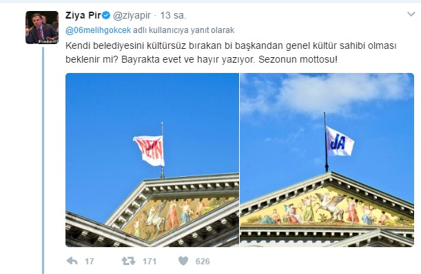 Ancak gerçek bambaşkaydı. HDP'li Ziya Pir Gökçek'e mention yaptı ve “Nein” ve 'Ya' bayraklarının Ocak ayında Almanya’da düzenlenen bir etkinlik için dikildiğini ve Türkiye’deki referandumla ilgisi olmadığını yazdı. İşte o paylaşımlar.