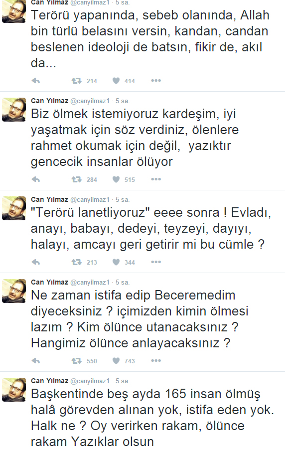 Can Yılmaz Twitter hesabından attığı mesajlar şöyle: "Terörü yapanın da, sebeb olanın da, Allah bin türlü belasını versin, kandan, candan beslenen ideoloji de batsın, fikir de, akıl da... Biz ölmek istemiyoruz kardeşim, iyi yaşatmak için söz verdiniz, ölenlere rahmet okumak için değil, yazıktır gencecik insanlar ölüyor."Terörü lanetliyoruz" eeee sonra ! Evladı, anayı, babayı, dedeyi, teyzeyi, dayıyı, halayı, amcayı geri getirir mi bu cümle ? Ne zaman istifa edip Beceremedim diyeceksiniz ? içimizden kimin ölmesi lazım ? Kim ölünce utanacaksınız ? Hangimiz ölünce anlayacaksınız ?"
