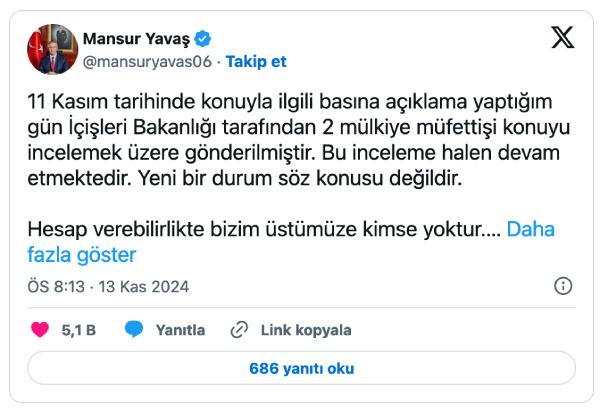ABB Başkanı Mansur Yavaş konuya ilişkin sosyal medya hesabından bir açıklama yaptı.