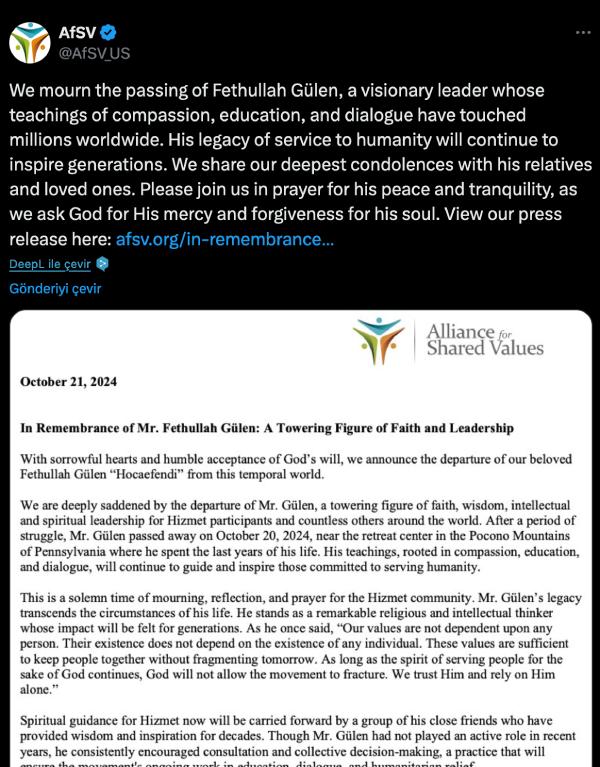 Hizmet Hareketi'ni temsil eden ve New York merkezli faaliyetlerini yürüten Paylaşılan Değerler İttifakı (Alliance for Shared Values / AfSV), Muhterem Fethullah Gülen Hocaefendi’nin vefatı üzerine sosyal medya platformu X’teki hesabından paylaşım yaptı.
