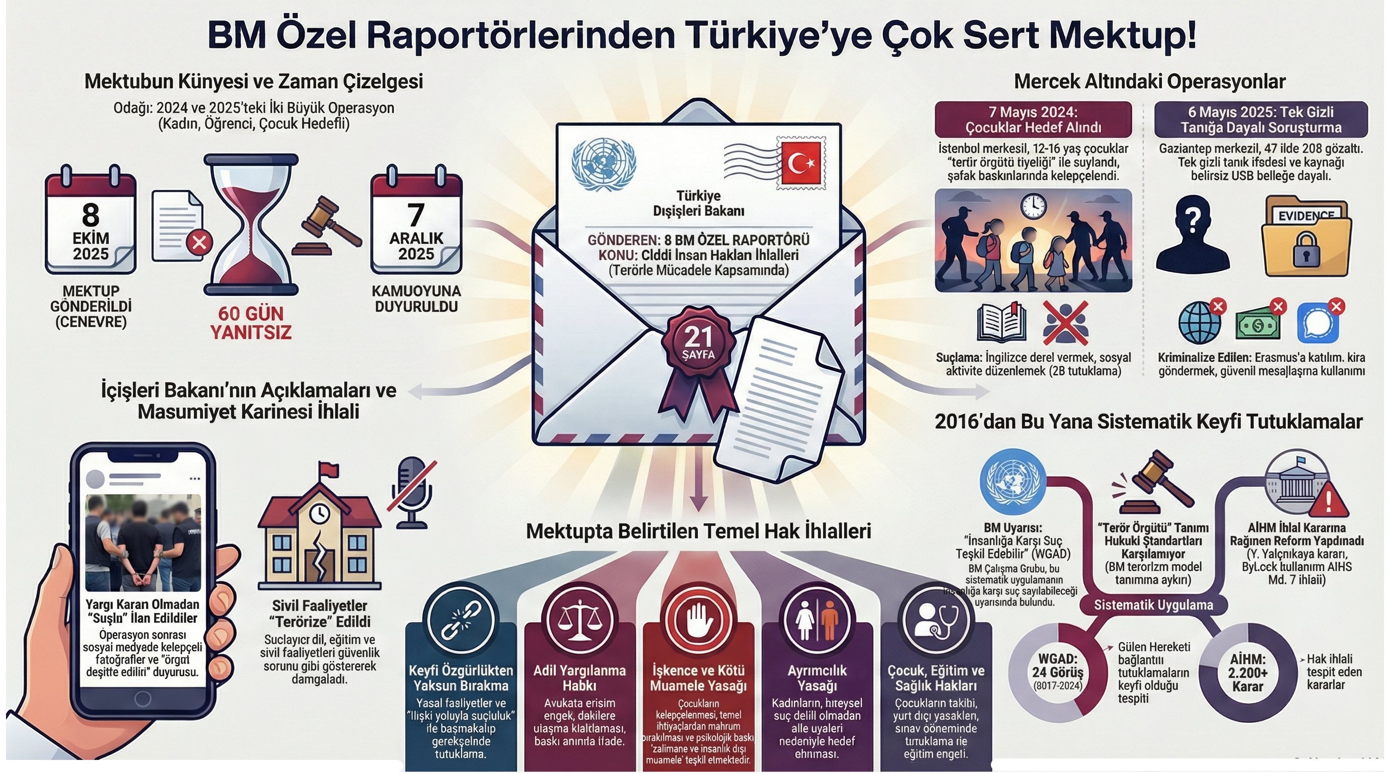Dışişleri Bakanı Hakan Fidan'a hitaben 21 sayfalık bir mektup gönderildi. Mektup 8 Ekim 2025’te “AL TUR 9/2025” referans numarası ile Cenevre’deki Türkiye Daimi Temsilciliği’ne iletildi. Mektup, terörle mücadele kapsamında yürütülen operasyonlarda yaşanan ciddi insan hakları ihlallerine ilişkin kaygıları ortaya koymuş ve 2017’den bu yana gönderilen çok sayıda önceki iletişime (mektup) atıfla, Hizmet Hareketi gönüllüsü olduğu iddia edilen kişilere yönelik ihlallerde süreklilik arz eden bir durum olduğu belirtildi.