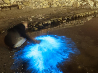 Deniz tabanında özellikle kahverengi birikmelerin bulunduğu alanlarda, suya temas edilmesiyle parlak mavi ışığın çıktığı görüldü.