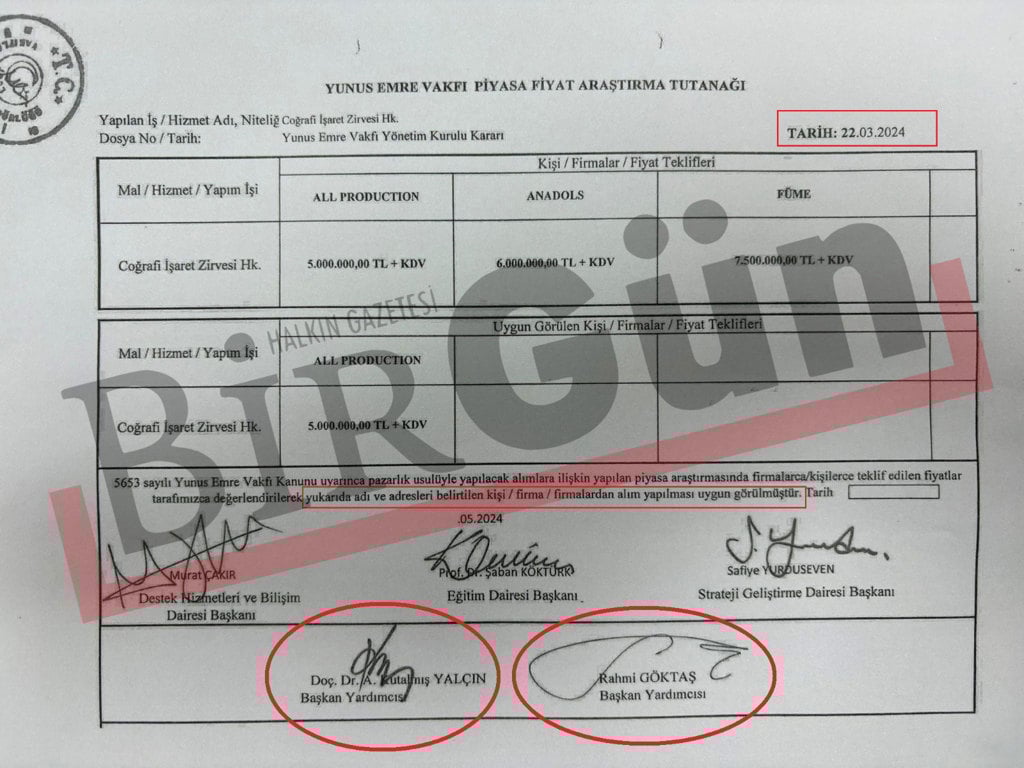 Soruşturma dosyasına göre, tutuklu bulunan eski Yunus Emre Enstitüsü Başkanı Şeref Ateş’in oğlu Enes Ateş, “All Production” adlı paravan şirket üzerinden vakfa 6 milyon TL’lik sahte fatura kesti. Fatura, “Coğrafi İşaretler Zirvesi Programı” adı altında düzenlenmiş, ancak Brüksel’de böyle bir etkinliğin hiç yapılmadığı ortaya çıktı.