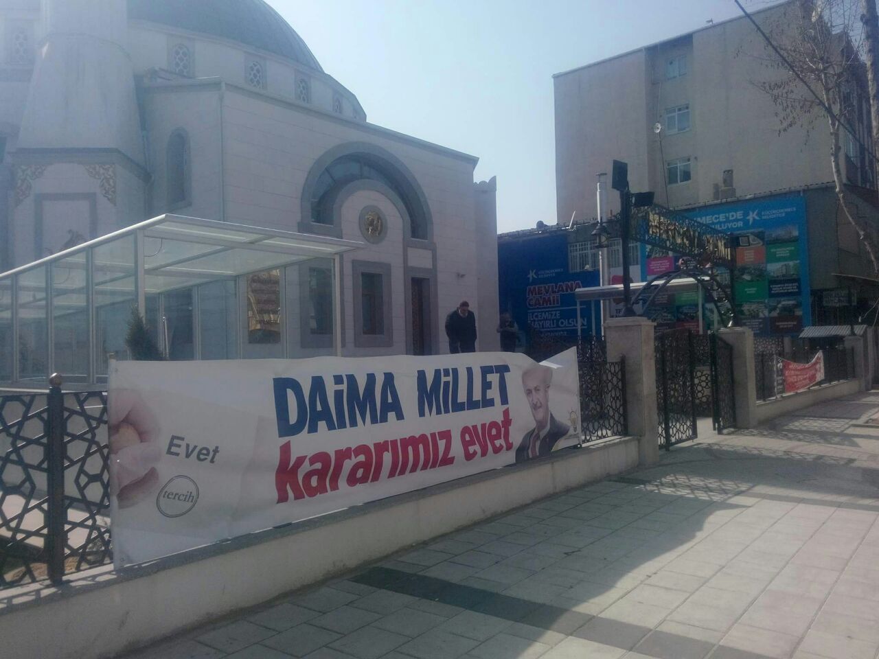 Camilerde 'evet' çağrısı yapan imamlardan, 'hayır' diyenleri 'şeytan' ilan eden din adamlarından sonra bu da oldu. AKP, İstanbul Küçükçekmece’de bulunan Mevlana camisi duvarına “Evet” pankartı astı.