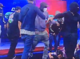 Sosyal medyada paylaşılan görüntülerde, yüzlerini maskeyle kapatan kişilerin, stüdyoda bulunanları rehin aldığı, spikerin cebine patlayıcı madde koyduğu görüldü.