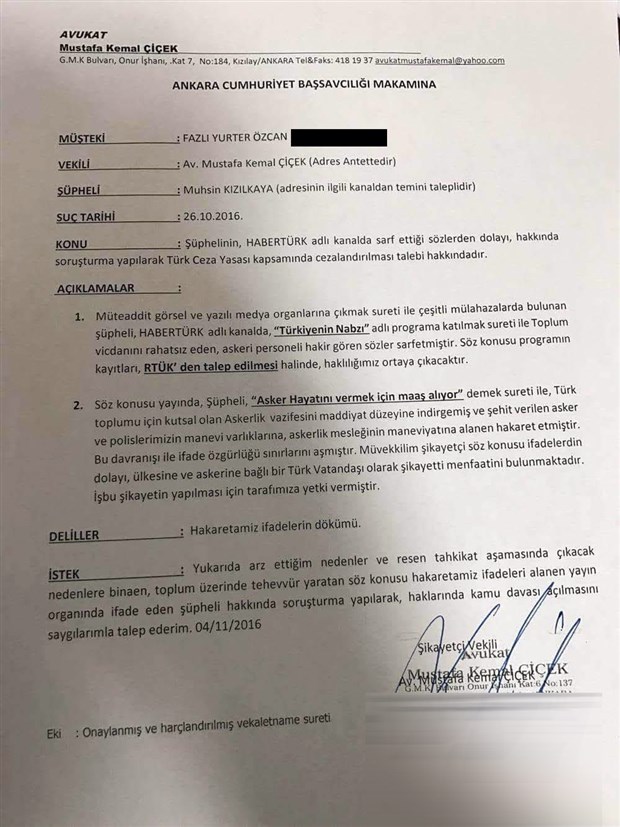 "Söz konusu yayında, Şüpheli, "Asker Hayatını vermek için maaş alıyor" demek sureti ile, Türk toplumu için kutsal olan Askerlik vazifesini maddiyat düzeyine indirgemiş ve şehit verilen asker ve polislerimizin manevi varlıklarına, askerlik mesleğinin maneviyatına alanen hakaret etmiştir. Bu davranışı ile ifade özgürlüğü sınırlarını aşmıştır. Müvekkilim şikayetçi söz konusu ifadelerdin dolayı, ülkesine ve askerine bağlı bir Türk Vatandaşı olarak şikayetti menfaatini bulunmaktadır. İşbu şikayetin yapılması için tarafımıza yetki vermiştir."