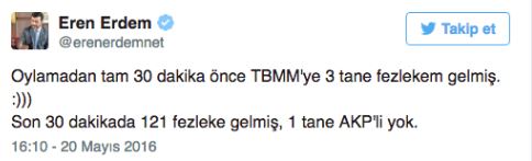CHP Milletvekili Eren Erdem, sosyal medya hesabından yaptığı açıklamada, dokunulmazlıkların kaldırılması için yapılan oylama öncesinden 121 fezlekenin Meclis'e gönderildiği, 3'ünün kendisine ait olduğunu söyledi.