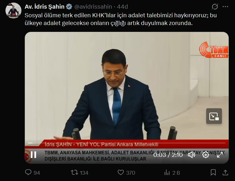 “Sayın Başkan, değerli milletvekilleri…15 Temmuz hain darbe girişiminden sonra ilan edilen olağanüstü hal döneminde, bir gecede 130 binden fazla insan, hakkında hiçbir mahkeme kararı olmaksızın, sadece bir Kanun Hükmünde Kararname’nin ekli listesinde isimleri yer aldığı için bir anda işinden, aşından, ekmeğinden, mesleklerinden, üniformalarından oldu.Bu insanlar suçlu mu? Hayır. Suçsuzlar. Ama suçlu gibi yaşadılar 9 yıldır.İşkence gördüler, aşağılandılar, dışlandılar, linç edildiler…