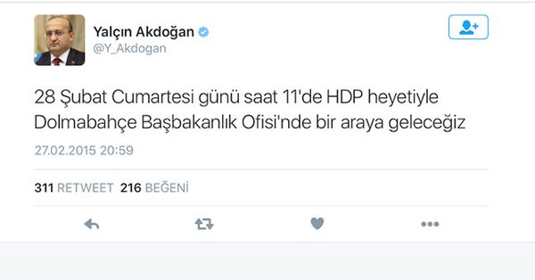 Tartışmalar sürerken sosyal medyada Başbakan Yardımcısı Yalçın Akdoğan'ın Dolmabahçe buluşmasından bir gün önce buluşmanın kiminle nerede ve ne zaman olacağına dair tweet attığı ortaya çıktı. Akdoğan söz konusu tweetinde şu ifadeleri kullanıyor: 28 Şubat Cumartesi günü saat 11'de HDP heyetiyle Dolmabahçe Başbakanlık Ofisi'nde bir araya geleceğiz."