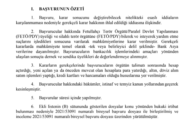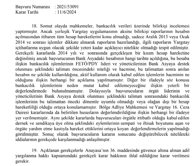 1-Anayasa Mahkemesi, 11/6/2024 tarihinde verip yeni tebliğ ettiği ve tıpkı Bekir Savcı ve diğerleri başvurusunda olduğu gibi “Kararlar Bilgi Bankasına” yüklemediği 2021/53091 numaralı başvuruda, Bank Asya’ya da bankacılık faaliyetinde bulunma ve dernek- sendika üyeliği nedeniyle verilen mahkumiyet kararlarıyla ilgili gerekçeli karar hakkının ihlaline karar vermiş.