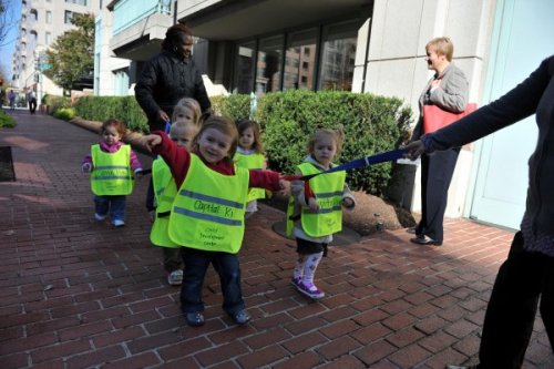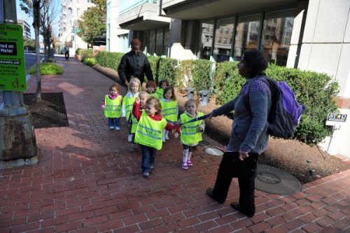 Washington D.C’de bir anaokulu, öğrencilerin dağılmaması için farklı yöntem kullanıyor. Öğrencilerin her birine de aynı zamanda trafikte fark edilmesi için işaretli yelek giydiren okul, bu sayede öğrencilerini bir arada tutabiliyor.