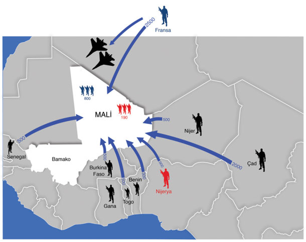Mali'de isyancı grupların hızla başkent Bamako'ya doğru ilerlemesi üzerine Fransa Cumhurbaşkanı Hollande, BM'nin de desteğini arkasına alarak 12 Ocak'ta havadan askeri operasyon düzenledi. İsyancı grupların stratejik noktalarını havadan bombalayan Fransa, daha önceden bu ülkeye giden özel kuvvetler öncülüğünde kara harekatı başlattı.