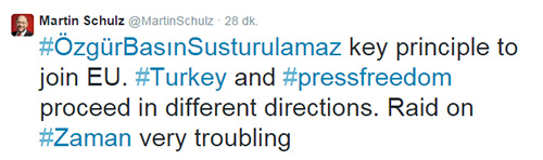 Schulz, Twitter’de yaptığı açıklamada #Özgürbasınsusturulamaz etiketini kullanarak gözaltılara tepki gösterdi. Zaman’a yapılan baskının ‘çok kaygı verici’ olduğunu vurgulayan Schulz, Türkiye ve basın hürriyetinin farklı yönlere gittiğini ifade etti.