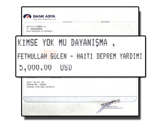 Fethullah Gülen Hocaefendi'den geldi. Hocaefendi 5 bin dolar bağış yaparak kampanyaya katıldı.