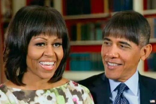Obama, eşi Michelle'in kaküllerine de değindi. Kakül eklenmiş fotoğraflarını gösterip, "Yeni dönemimde Michelle'in taktiğini kullanma kararı aldık" dedi.