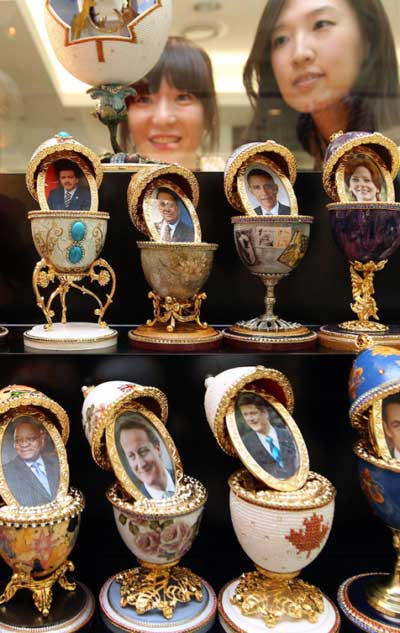 Sergide, Liderlerin fotoğrafları, özel yumurtaların içine yerleştirilmiş halde yeralıyor. Özel yumurtalar, G-20 liderler zirvesinde satışa çıkarılacak