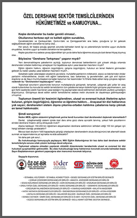 'Dershaneleri sistem dışına çıkartma - ortadan kaldırma' çabalarına karşı çıkmanın en temel hakları olduğunu söyleyen dershaneciler, toplumun demokratikleşme beklentilerinin en yüksek seviyede olduğu ve yeni demokratikleşme paketlerinin açıklandığı böylesi bir ortamda dershaneleri ortadan kaldırmayı amaçlayan hür teşebbüse aykırı yasa tasarılarının niçin hazırlandığını da sordu.