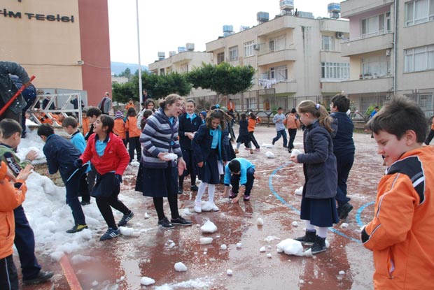 Gülen öğrencileri kartopu oynayarak derse başladı.