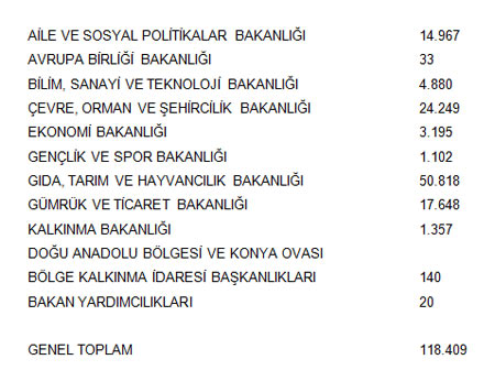Ekonomi Bakanlığına 3 bin 195, Kalkınma Bakanlığına 1.357, Gençlik ve Spor Bakanlığına 1.102,