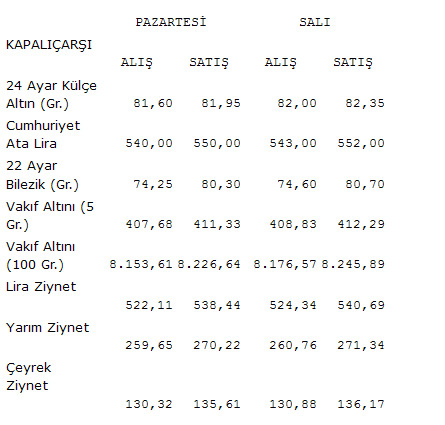 İstanbul Kapalıçarşı'da alınıp satılan altın türlerinin, önceki ve bugün itibariyle kapanış fiyatları (TL) şöyle: