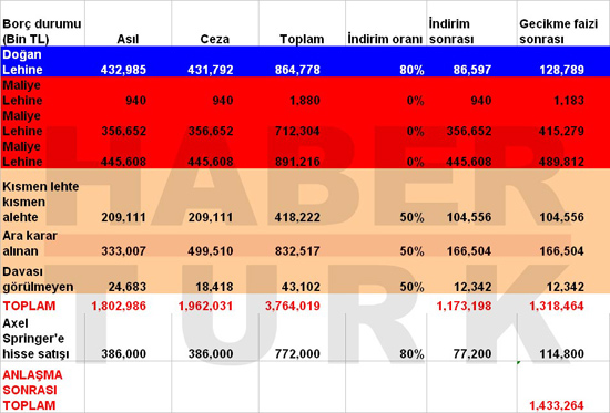 Gruba Axel Springer'e hisse satışı nedeniyle kesilen ceza ve faizle birlikte 1 milyar lirayı aşan davasında da büyük bir indirim söz konusu olacak. Bu davada Doğan'ın lehine karar çıkmış Maliye bu kararı temyize götürmüştü. Eğer Doğan bu ödemeden de kurtulmak isterse cezası silinecek. Faiz de yeniden hesaplanacak. Üstelik anapara tutarı olan 386 milyon liranın da sadece yüzde 20'sini ödeyecek olan Grup bundan da kurtulacak. Bu tutar için 2005 yılından bu yana gecikme faizi hesaplandığında indirim sonrası 114 milyon liraya inecek. Böylece
