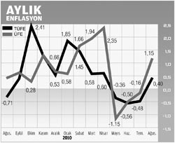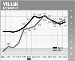 endeksi (TÜFE) ağustosta bir önceki aya göre yüzde 0,40, üretici fiyatları endeksi ise yüzde 1,15 ile beklentilerin üzerinde artış gösterdi. Ağustos ayı itibarıyla yıllık enflasyon ise TÜFE'de yüzde 8,33, ÜFE'de yüzde 9,03 oldu. Sekiz aylık enflasyon tüketici fiyatlarında yüzde 3,50, üretici fiyatlarında yüzde 5,98 düzeyinde gerçekleşti. Geçen ay itibarıyla 12 aylık ortalamalara göre yıllık enflasyon tüketici fiyatlarında yüzde 7,83, üretici fiyatlarında yüzde 6,18 düzeyinde oldu.