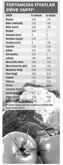 otel ve restoranların fiyatına bakmadan topladığını söyledi. Domatesin 7,30 liraya kadar çıktığını kaydeden Uysal, "Çeri domatesi 9 lira. Domatesin hızlı düşmesini beklemek doğru olmaz. Domateste bu yıl 2 liranın altında bir fiyat beklemiyoruz." dedi. Antalya