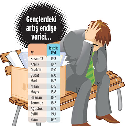 Bugün'ün haberine göre, Türkiye İstatistik Kurumu (TÜİK), Ekim 2014 dönemi işgücü verilerini açıkladı. Sonuçlar, işsizlik oranının çift haneli rakamlara iyice yerleştiğini gösteriyor.Verilere göre 2013’ün Ekim ayında yüzde 9,1 olan işsizlik oranı, 2014’ün aynı döneminde yüzde 10,4’e çıktı. İşsizlik oranı eylülde yüzde 10,5’ti. Mevsim etkilerinden arındırılmış işsizlik oranı ise yüzde 10,6 oldu.