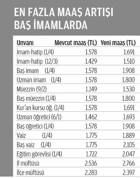 Müezzin ve Kur'an kursu hocalarının aylığı da 81 ile 325 TL arasında değişen rakamlarda arttı. İlçe müftülerinin maaşı ise 114 lira yükseldi. En yüksek artış ise 792 lira ile dini Yüksek İhtisas Merkezi müdürünün maaşında oldu. Yeni