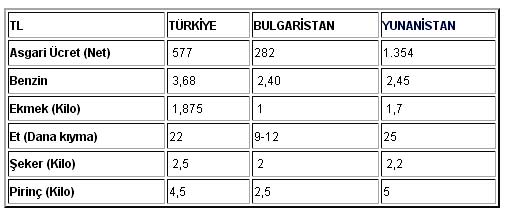 kırmızı biber (kilo) 3 TL, salatalık (kilo) 3 TL, muz (kilo) 1,5 TL, portakal ve mandalina (kilo) 1,2 TL, un (kilo) 1,4 TL, pirinç 2,5 TL, dana (kıyma, bonfile, parça ve benzeri) 9-12 TL, piliç 3,5-5 TL'den satılıyor. Bulgaristan'da 1 litre benzin ise yılbaşında yapılan zamla 2,4 TL oldu.