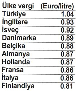 Petrol Sanayi Derneği (PETDER) verilerine göre, 2011 yılında benzinde litrede ortalama 1.04 euro vergi alınan Türkiye, AB ülkeleri arasında en yüksek verginin bulunduğu ülke oldu. Benzinde vergi miktarı bakımından Türkiye'yi 0.93 euro ile İngiltere, 0.92 euro ile İsveç, 0.89 euro ile