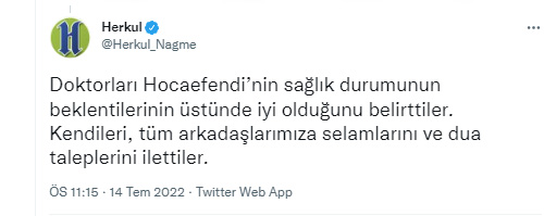 Herkul Nagme hesabından yapılan açıklamada, Kıymetli dostlar, Muhterem Hocaefendi, rutin kontroller ve detaylı tahliller için 1 hafta süre ile kaldığı hastaneden bugün ayrılmış kampa dönmüş bulunmaktadır. Doktorları kendilerinin sağlık durumunun beklentilerinin üstünde iyi olduğunu belirttiler. Kendileri, tüm arkadaşlarımıza selamlarını iletti ve dua taleplerini ifade buyurdular.” denildi.