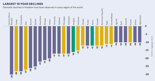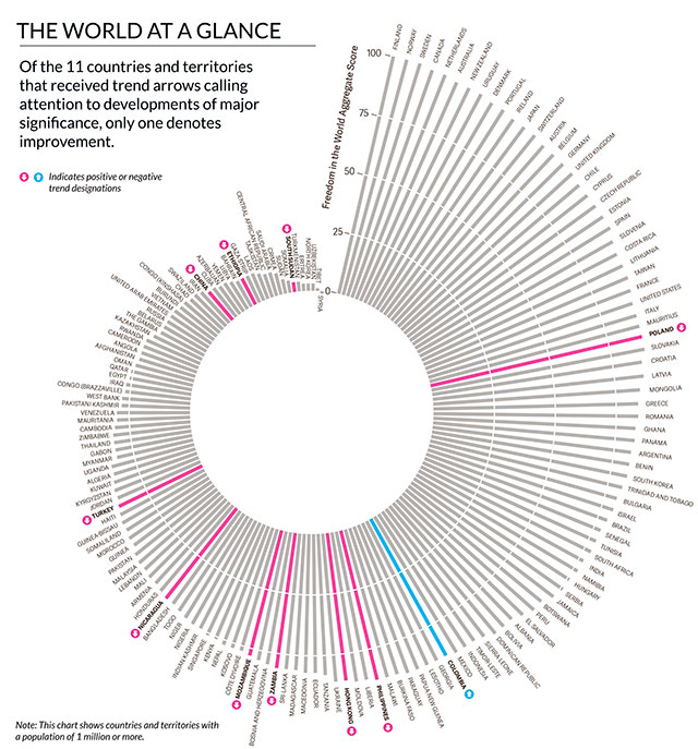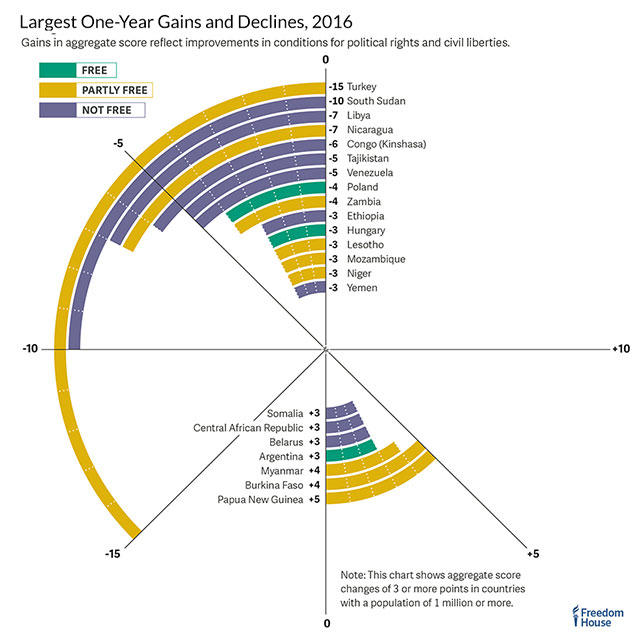 * Türkiye 15 puan düşerek, 2016’da özgürlüklerin en çok gerilediği ülke oldu. Son 10 yıllık trend içindeyse, özgürlüklerin en çok gerilediği ikinci ülke oldu, ilk sıradaysa Orta Afrika Cumhuriyeti yer aldı.