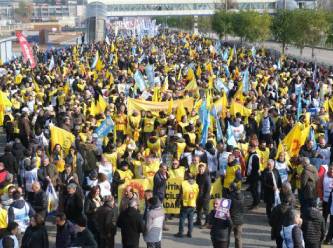 Tandoğan'da saat 13.00'te başlayacak miting için yürüyüşe geçen işçişler, taleplerini taşıdıkları pankartlarla duyurmaya devam etti .