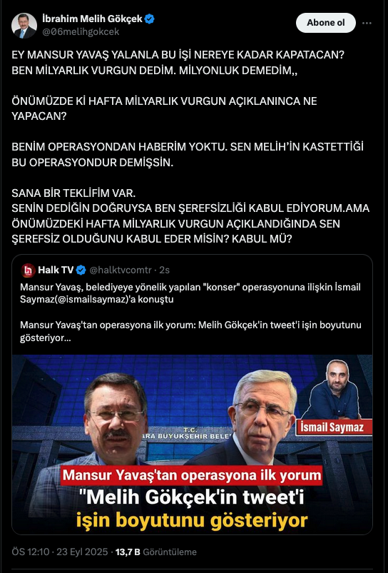 Melih Gökçek’in son paylaşımı şöyle: “Ey Mansur Yavaş, yalanla bu işi nereye kadar kapatacaksın? Ben milyarlık vurgun dedim. Milyonluk demedim. Önümüzdeki hafta milyarlık vurgun açıklanınca ne yapacaksın? Benim operasyondan haberim yoktu. Sen “Melih’in kastettiği bu operasyondur” demişsin. Sana bir teklifim var: Senin dediğin doğruysa ben şerefsizliği kabul ediyorum. Ama önümüzdeki hafta milyarlık vurgun açıklandığında sen şerefsiz olduğunu kabul eder misin? Kabul mü?”
