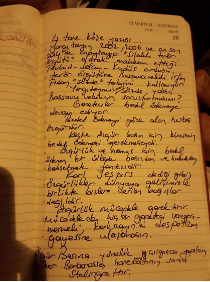 -Gazeteciler bedel ödemeye devam ediyor. Bedel ödemeyi göze alan herkes özgürdür. Keşke özgür basın için kimsenin bedel ödemesi gerekmeseydi. Özgürlük ve namus için bedel ödenene bir ülkede basından ve hukuktan bahsetmek fantezidir...