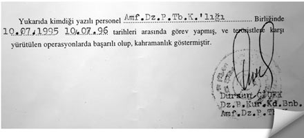 deniz piyade tabur komutanlığı görevi esnasında resmî evraklara attığı imzalara ulaştı. O dönemde binbaşı olan Çiçek'in, tabura bağlı birliklerde 1995-96 yıllarında görev yapan bazı askerlere terörle mücadelede gösterdikleri başarılardan dolayı verilen takdir belgesinin altındaki imzaları da
