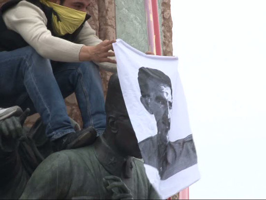 Öcalan'ın posteri asıldı. Maskeli bir genç, anıta çıkarak, elindeki Öcalan posterini, astı. Bir süre bekleyen genç, daha sonra posterle birlikte anıttan aşağı indi.