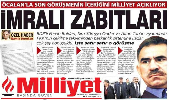 Abdullah Öcalan ile adada görüşen BDP heyetinin konuşmalarının içeriğini duyuran 28 Şubat 2013 tarihli Milliyet'in manşeti "barış sürecine provokasyon" iddialarına muhatap olmuştu.