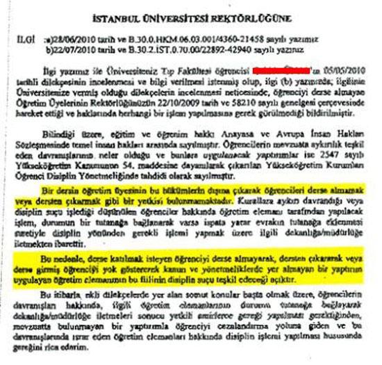 Cerrahpaşa Tıp Fakültesi Dekanlığı Z. Ü.'nün yazılı itirazını Rektörlüğe, Rektörlük de YÖK'e gönderdi. Başvuruyu inceleyen YÖK Hukuk Müşavirliği, Temmuz'da üniversiteye gönderdiği yanıtında, eğitim ve