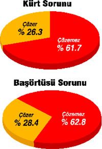 Kürt sorununu, yüzde 62.8'i de başörtüsü sorununu çözemeyeceği görüşünde.