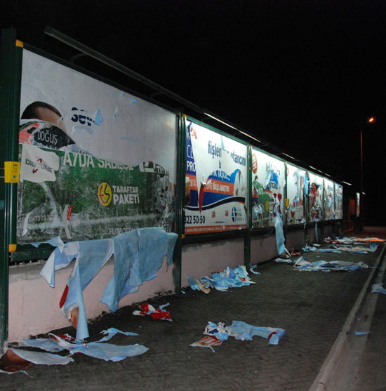 Polis, afişlere yırtarak zarar veren 7 kişiyi gözaltına alarak Odunpazarı İlçe Emniyet Müdürlüğüne götürdü.