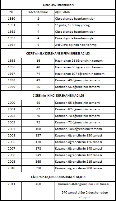 Cizre'de henüz hiçbir dershane yokken, 1990 yılında sadece 2 öğrenci üniversiteyi bu ilçeden kazanırken bu rakam 2011 itibariyle tam 460 oldu. Bu elbette ki fedakar Anadolu insanı tarafından finanse edilen ve